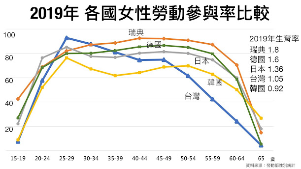 台灣女性職涯曲線獨樹一幟,呈現倒V字型,主要的成因是兩大波因刻板性別角色造成的離職潮:30-44歲的婚育離職潮(勞參率重跌18.2%,同一時段瑞典、德國分別升高10.4%、5.5%),和50-60歲的顧孫離職潮(勞參率慘跌32.4%,同一時段瑞典、德國小跌4.9%、6.8%)。從三十歲婚育年齡開始,到四十幾歲小孩都上小學了,還陸續離職,以及五十歲以後的阿嬤也義無反顧地離職,拖累兩代女性的勞動力,而且生育率還超低,顯示我們缺乏北歐的體認:「國家需要有足夠的勞動力,以滿足社會保障體系的需求」,「因為托育制度相對健全,女性能在照顧子女的同時進入勞動市場工作,因此增加了勞動力的供應、使生產力得以提升。」